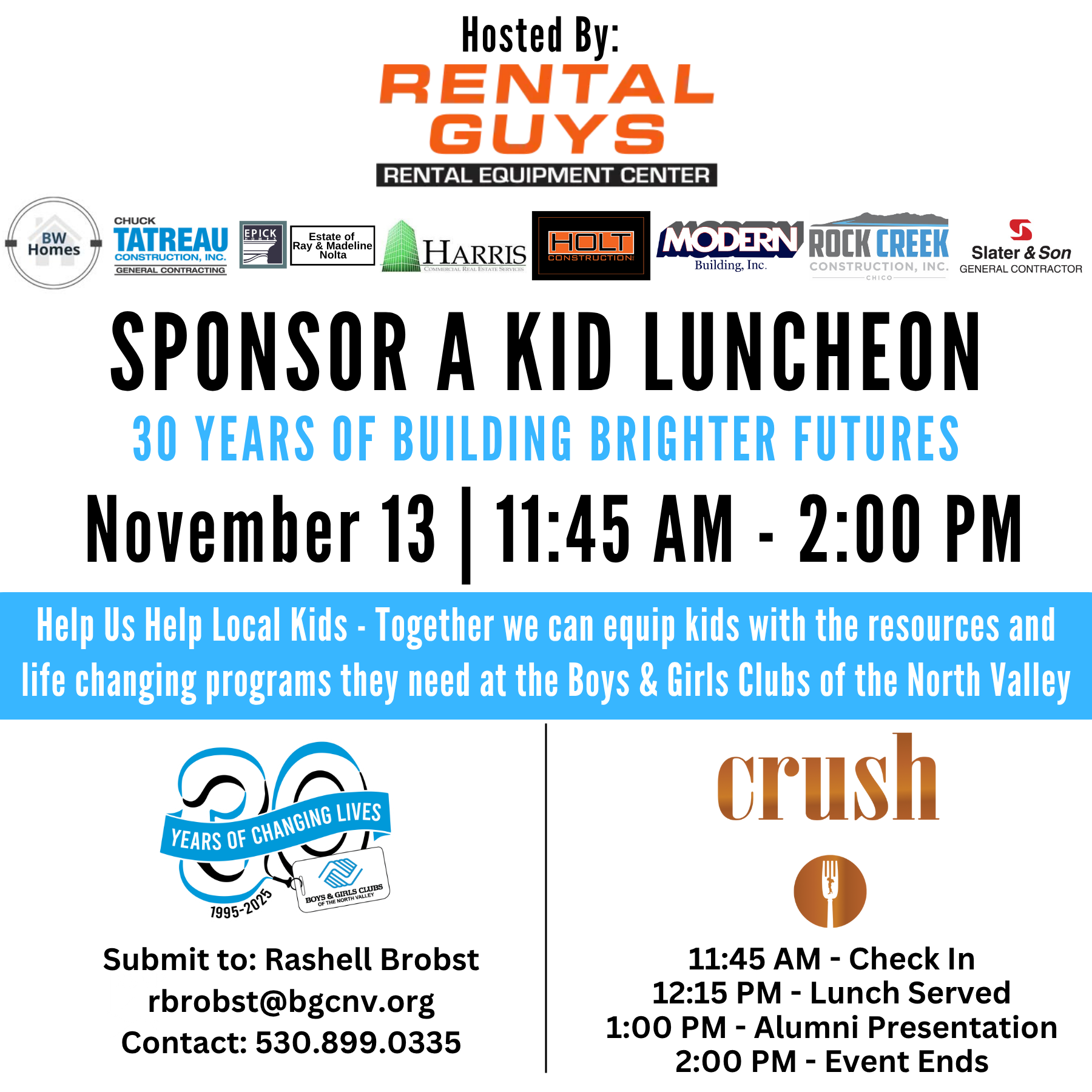 Join your hosts Rental Guys, BW Homes, Chuck Tatreau Construction, Epick Homes, Estate of Ray & Madeline Nolta, Harris Commercial Real Estate, Holt Construction, Modern Building, Rock Creek Construction, and Slater & Son for Sponsor a Kid Luncheon on Thursday Nov. 13th to help build brighter futures for local kids and families!