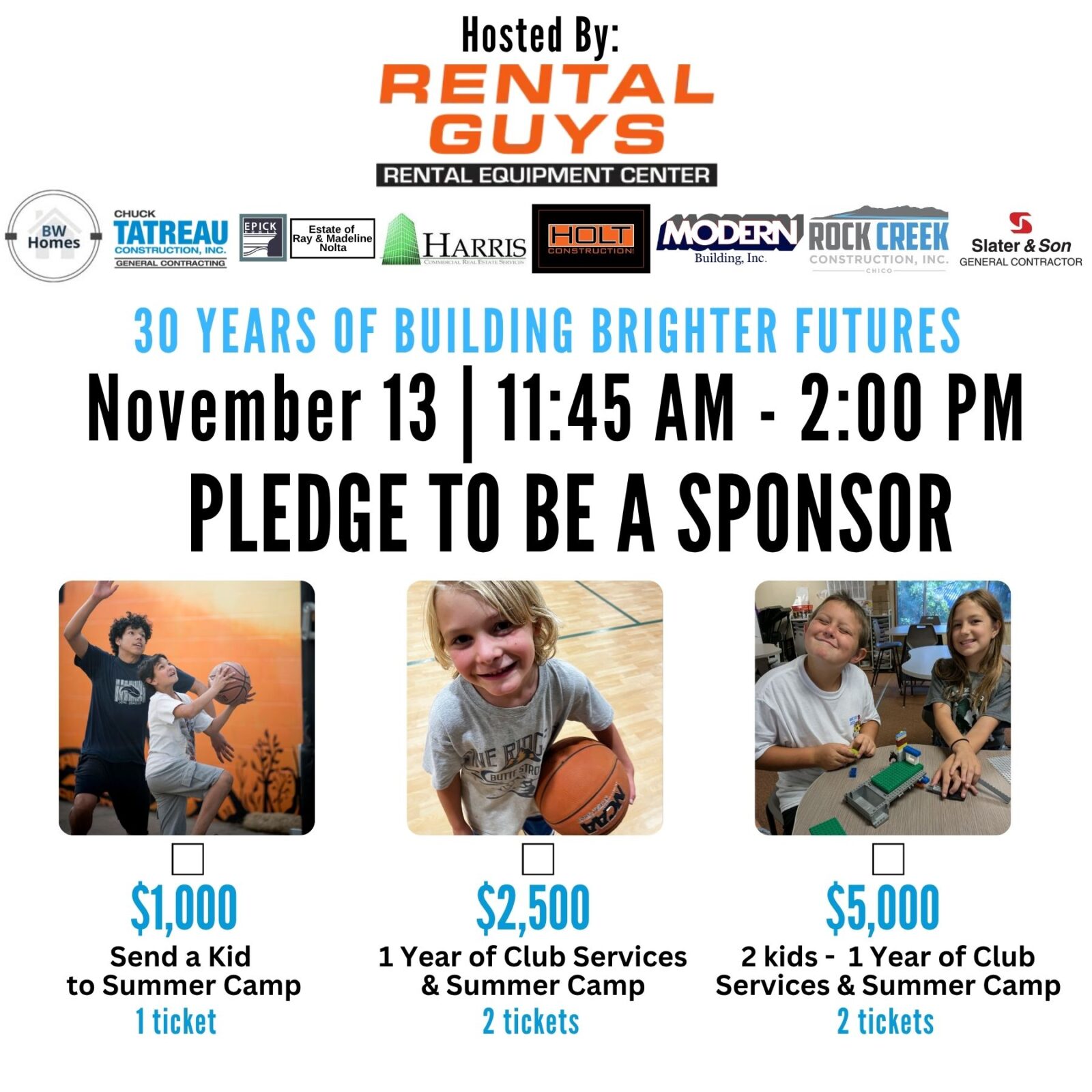 Join your hosts Rental Guys, Bill Webb Homes, Chuck Tatreau Construction, Epick Homes, Estate of Ray & Madeline Nolta, Harris Commercial Real Estate, Holt Construction, Modern Building, Rock Creek Construction, and Slater & Son for Sponsor a Kid Luncheon on Thursday Nov. 13th and help build brighter futures for local kids and families!